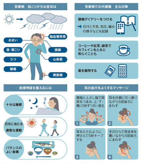 台風が近づくと気圧の変化のためか片頭痛がする。雨の日は古傷が痛む。気温が下がると、ぜんそくの発作が起こりやすい気がする。曇天や雨が続くと、うつがひどくなる。気象の変化が影響したとみられる不調は意外に多いと思います。また脳血管疾患や心疾患、腰痛や関節痛のほか、首・肩こり、更年期障害、歯周病などの症状が悪化する方もおられると思います。近年は夏の猛暑や急な大雨が目立つようになり、夏バテによる食欲不振やだるさ、睡眠不足なども加わって本当につらいですね。